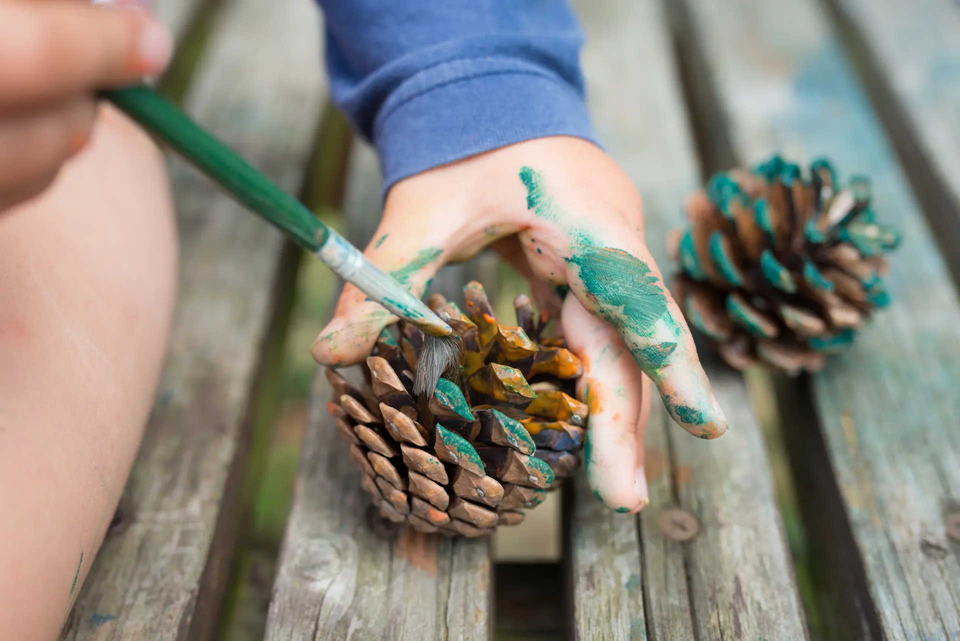 Breng de natuur naar binnen met slingers van dennenappels en vrolijk gekleurde eikeltjes in een potje.
